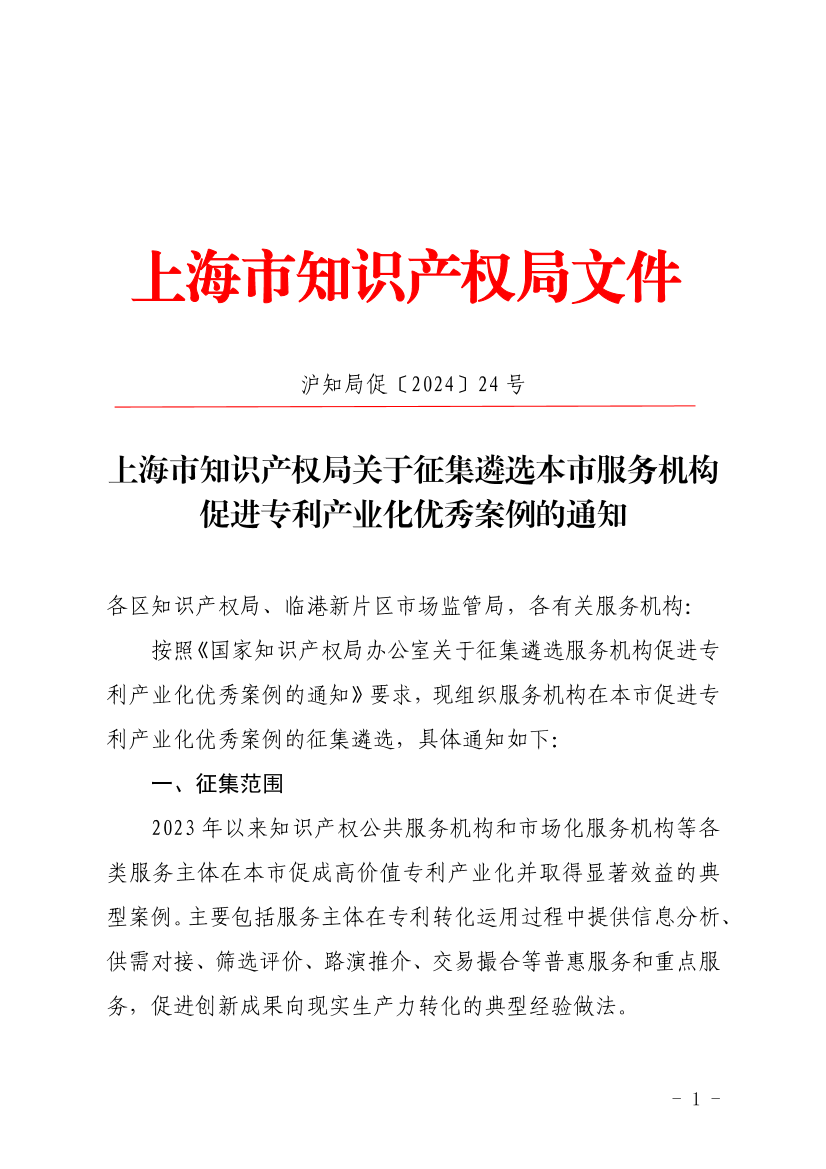 上海市知识产权局关于征集遴选本市服务机构促进专利产业化优秀案例的通知