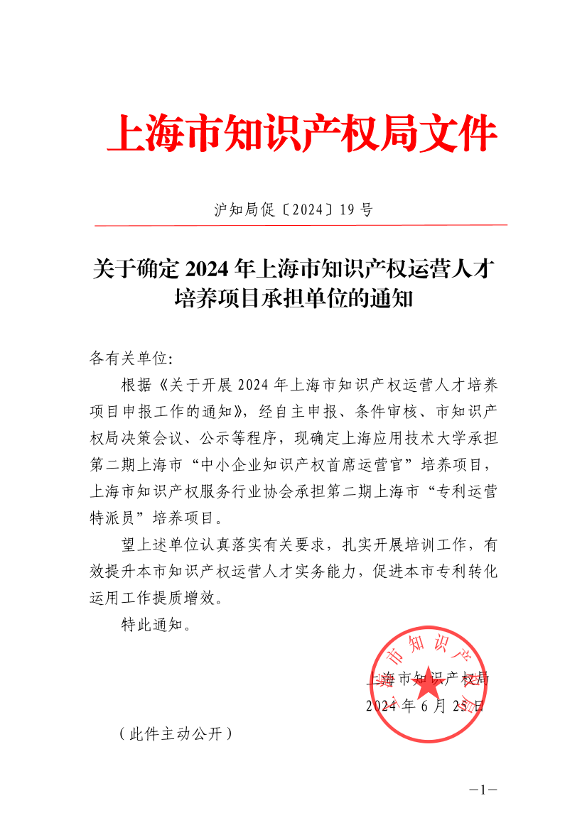 关于确定2024年上海市知识产权运营人才培养项目承担单位的通知