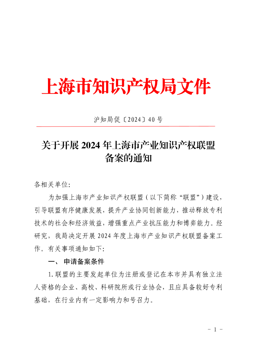 为加强上海市产业知识产权联盟(以下简称“联盟”)建设,引导联盟有序健康发展,提升产业协同创新能力,推动释放专利技术的社会和经济效益,增强重点产业抗压能力和博弈能力。经研究,我局决定开展2024年度上海市产业知识产权联盟备案工作。有关事项通知如下: