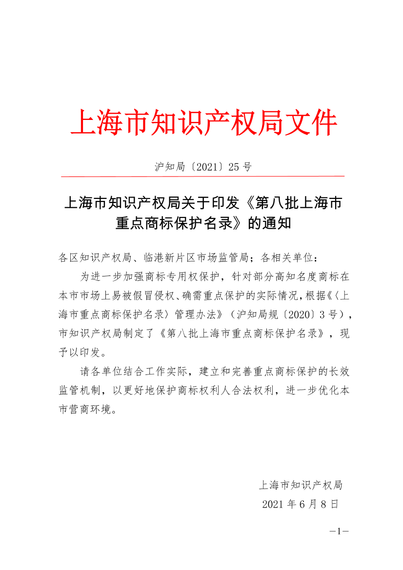 为进一步加强商标专用权保护,针对部分高知名度商标在本市市场上易被假冒侵权、确需重点保护的实际情况,根据《〈上海市重点商标保护名录〉管理办法》(沪知局规〔2020〕3号),市知识产权局制定了《第八批上海市重点商标保护名录》,现予以印发。