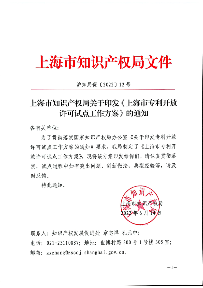 为了贯彻落实国家知识产权局办公室《关于印发专利开放许可试点工作方案的通知》要求,我局制定了《上海市专利开放许可试点工作方案》,现将该方案印发给你们,请认真贯彻落实,试点过程中如有突出问题、创新做法、典型经验等,请及时反馈。