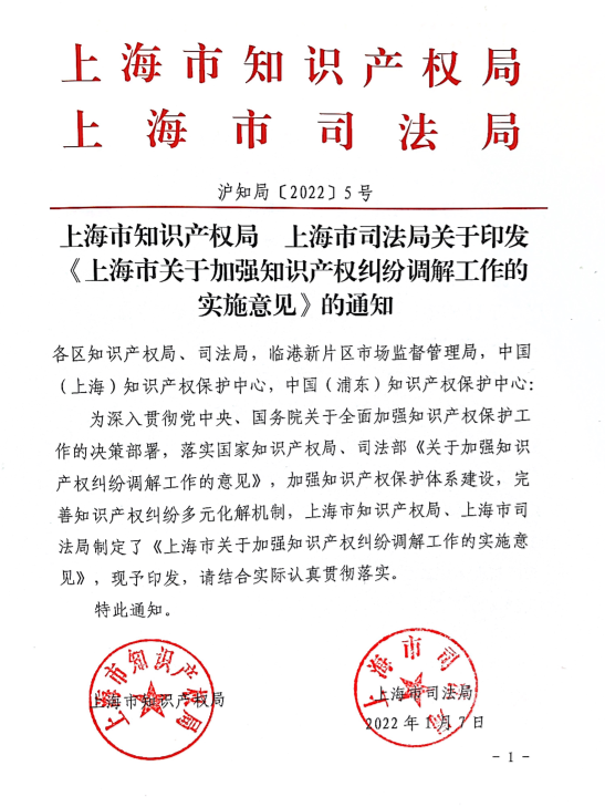 上海市关于加强知识产权纠纷调解工作的实施意见
