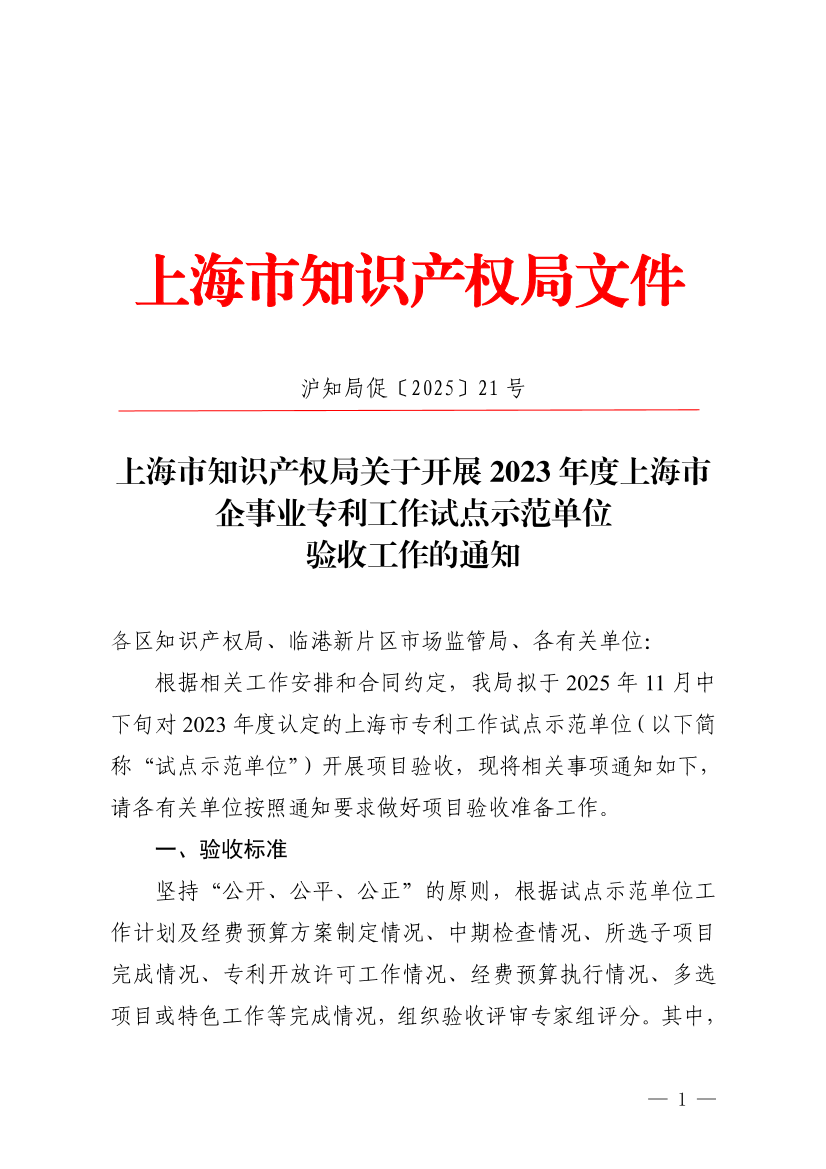 根据相关工作安排和合同约定,我局拟于2025年11月中下旬对2023年度认定的上海市专利工作试点示范单位(以下简称“试点示范单位”)开展项目验收,现将相关事项通知如下,请各有关单位按照通知要求做好项目验收准备工作。