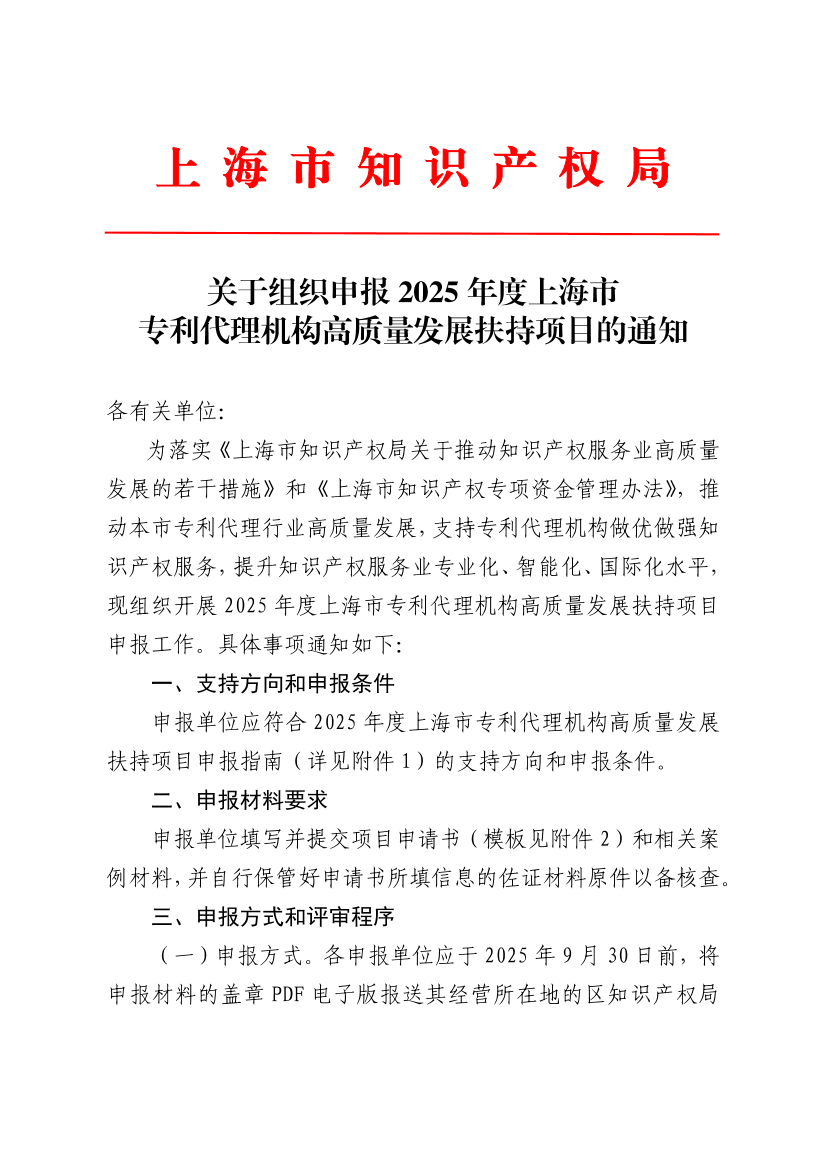 为落实《上海市知识产权局关于推动知识产权服务业高质量发展的若干措施》和《上海市知识产权专项资金管理办法》,推动本市专利代理行业高质量发展,支持专利代理机构做优做强知识产权服务,提升知识产权服务业专业化、智能化、国际化水平,现组织开展2025年度上海市专利代理机构高质量发展扶持项目申报工作。具体事项通知如下:
