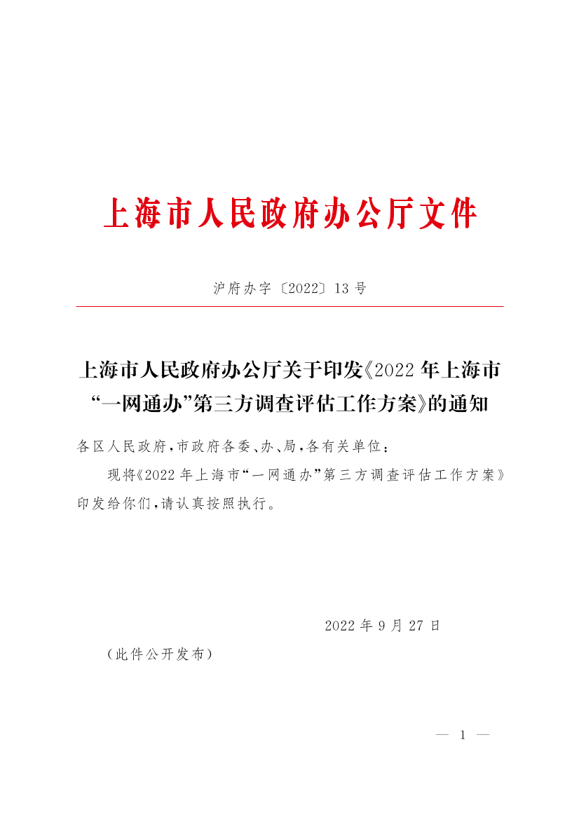 上海市人民政府办公厅关于印发《2022年上海市“一网通办”第三方调查评估工作方案》的通知