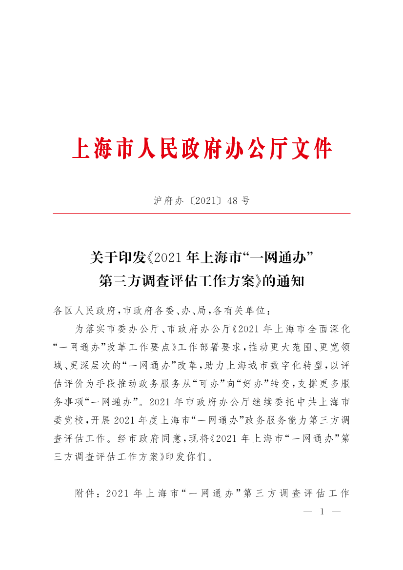 关于印发《2021年上海市“一网通办”第三方调查评估工作方案》的通知