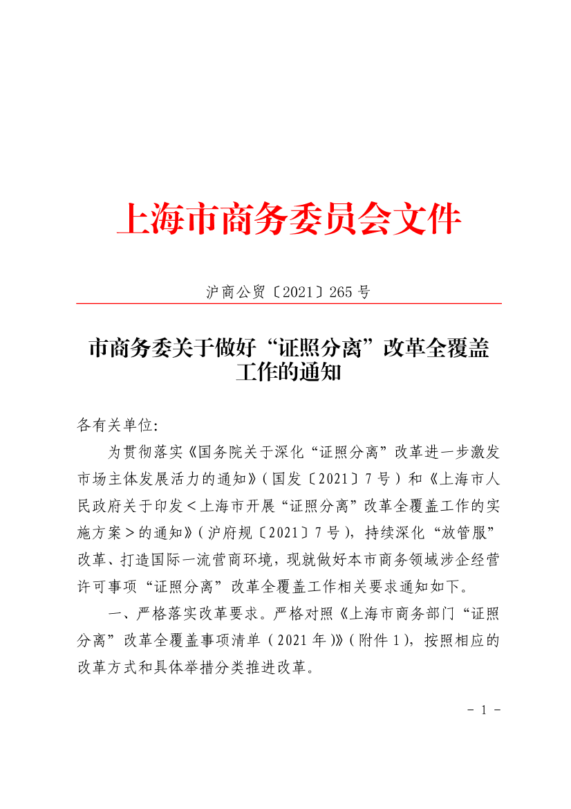 为贯彻落实《国务院关于深化“证照分离”改革进一步激发市场主体发展活力的通知》(国发〔2021〕7号)和《上海市人民政府关于印发<上海市开展“证照分离”改革全覆盖工作的实施方案>的通知》(沪府规〔2021〕7号),持续深化“放管服”改革、打造国际一流营商环境,现就做好本市商务领域涉企经营许可事项“证照分离”改革全覆盖工作相关要求通知如下。