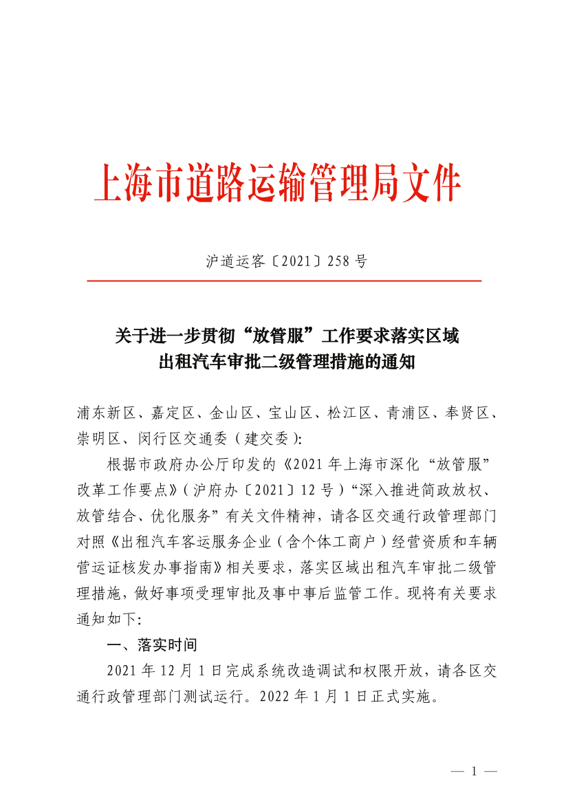 根据市政府办公厅印发的《2021年上海市深化“放管服”改革工作要点》(沪府办〔2021〕12号)“深入推进简政放权、放管结合、优化服务”有关文件精神,请各区交通行政管理部门对照《出租汽车客运服务企业(含个体工商户)经营资质和车辆营运证核发办事指南》相关要求,落实区域出租汽车审批二级管理措施,做好事项受理审批及事中事后监管工作。现将有关要求通知如下:
