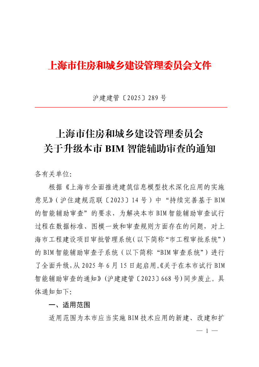 根据《上海市全面推进建筑信息模型技术深化应用的实施意见》(沪住建规范联〔2023〕14号)中“持续完善基于BIM的智能辅助审查”的要求,为解决本市BIM智能辅助审查试行过程在数据标准、图模一致和审查规则方面存在的问题,对上海市工程建设项目审批管理系统(以下简称“市工程审批系统”)的BIM智能辅助审查子系统(以下简称“BIM审查系统”)进行了全面升级,从2025年6月15日起启用。《关于在本市试行BIM智能辅助审查的通知》(沪建建管〔2023〕668号)同步废止。具体通知如下: