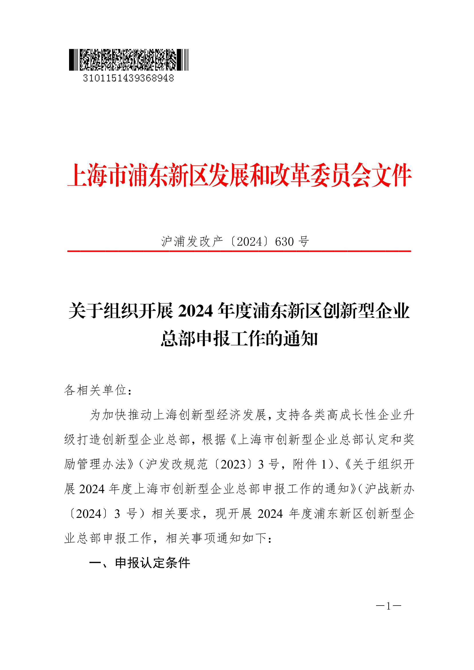 为加快推动上海创新型经济发展,支持各类高成长性企业升级打造创新型企业总部,根据《上海市创新型企业总部认定和奖励管理办法》(沪发改规范〔2023〕3号,附件1)、《关于组织开展2024年度上海市创新型企业总部申报工作的通知》(沪战新办〔2024〕3号)相关要求,现开展2024年度浦东新区创新型企业总部申报工作,相关事项通知如下: