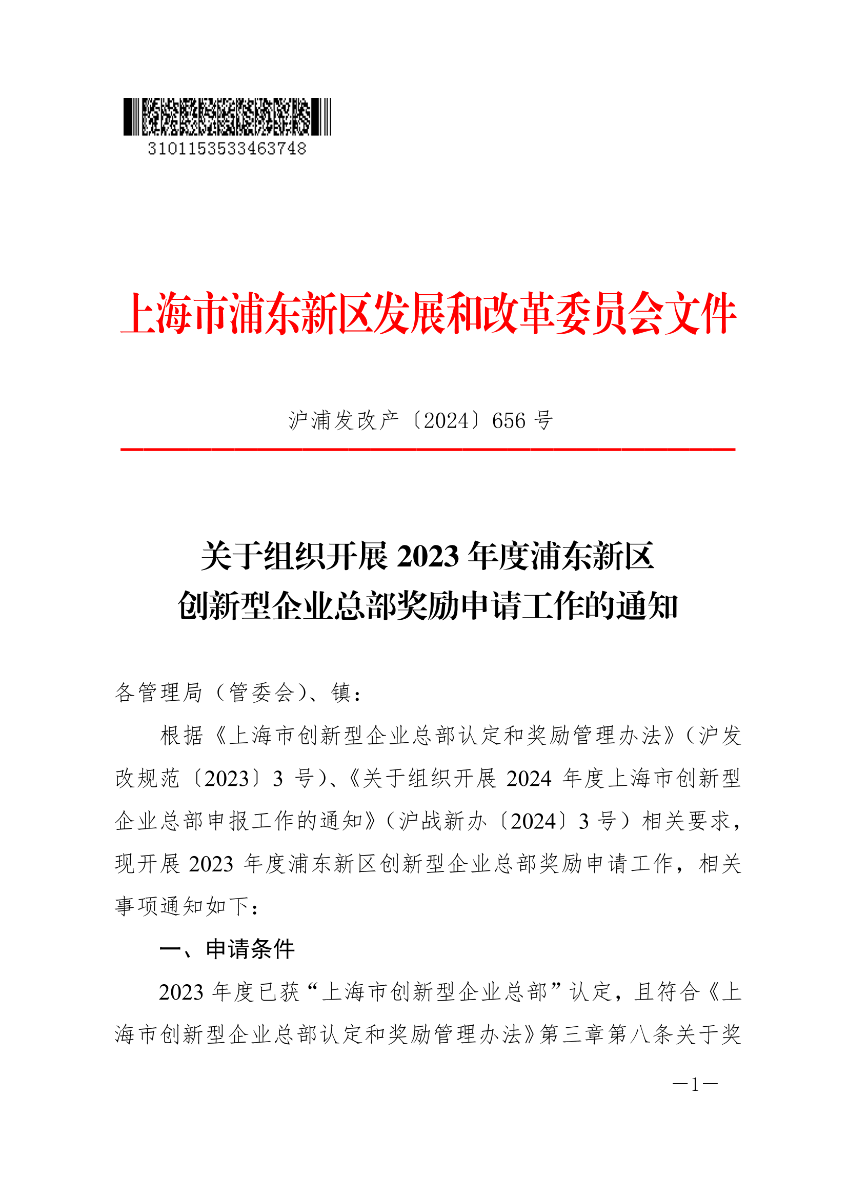 根据《上海市创新型企业总部认定和奖励管理办法》(沪发改规范〔2023〕3号)、《关于组织开展2024年度上海市创新型企业总部申报工作的通知》(沪战新办〔2024〕3号)相关要求,现开展2023年度浦东新区创新型企业总部奖励申请工作,相关事项通知如下: