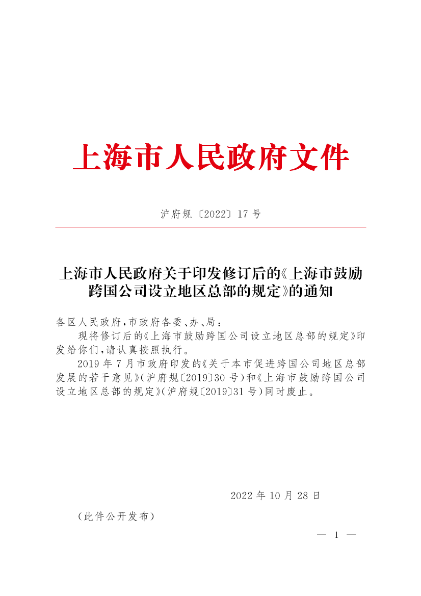 2019年7月市政府印发的《关于本市促进跨国公司地区总部发展的若干意见》(沪府规〔2019〕30号)和《上海市鼓励跨国公司设立地区总部的规定》(沪府规〔2019〕31号)同时废止。
