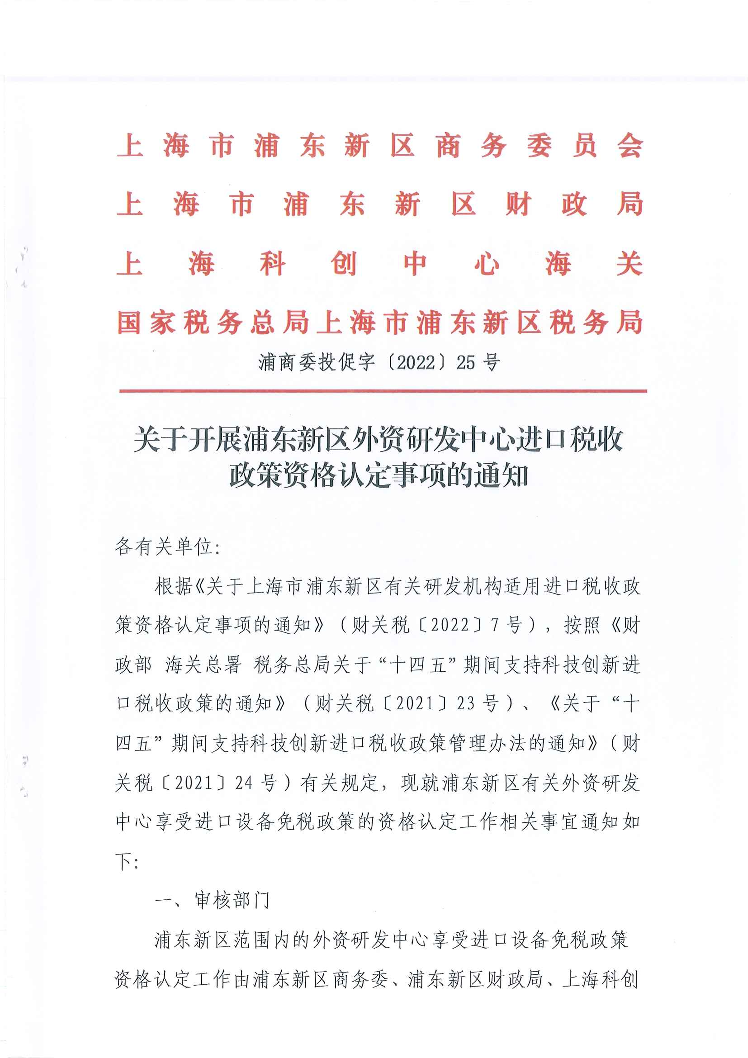 根据《关于上海市浦东新区有关研发机构适用进口税收政策资格认定事项的通知》(财关税〔2022〕7号),按照《财政部 海关总署 税务总局关于“十四五”期间支持科技创新进口税收政策的通知》(财关税〔2021〕23号)、《关于“十四五”期间支持科技创新进口税收政策管理办法的通知》(财关税〔2021〕24号)有关规定,现就浦东新区有关外资研发中心享受进口设备免税政策的资格认定工作相关事宜通知如下: