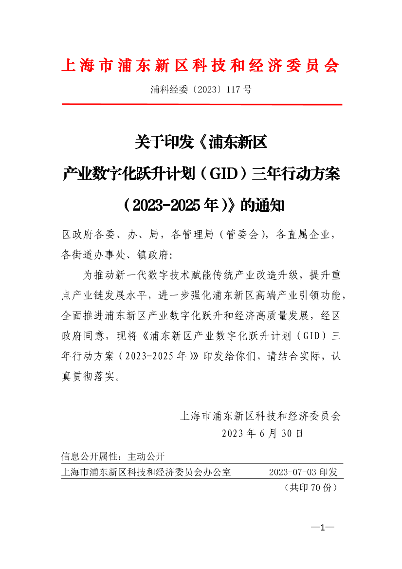 为推动新一代数字技术赋能传统产业改造升级,提升重点产业链发展水平,进一步强化浦东新区高端产业引领功能,全面推进浦东新区产业数字化跃升和经济高质量发展,经区政府同意,现将《浦东新区产业数字化跃升计划(GID)三年行动方案(2023-2025年)》印发给你们,请结合实际,认真贯彻落实。
