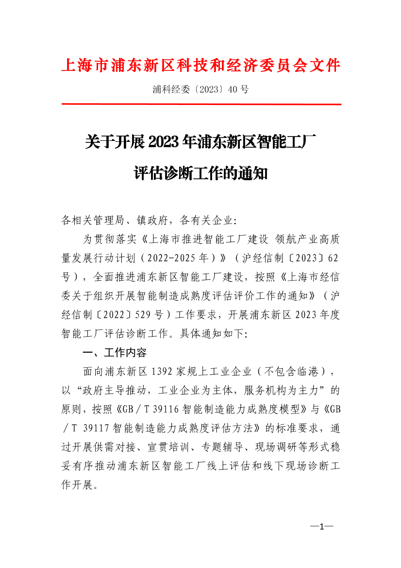 为贯彻落实《上海市推进智能工厂建设 领航产业高质量发展行动计划(2022-2025年)》(沪经信制〔2023〕62号),全面推进浦东新区智能工厂建设,按照《上海市经信委关于组织开展智能制造成熟度评估评价工作的通知》(沪经信制〔2022〕529号)工作要求,开展浦东新区2023年度智能工厂评估诊断工作。具体通知如下: