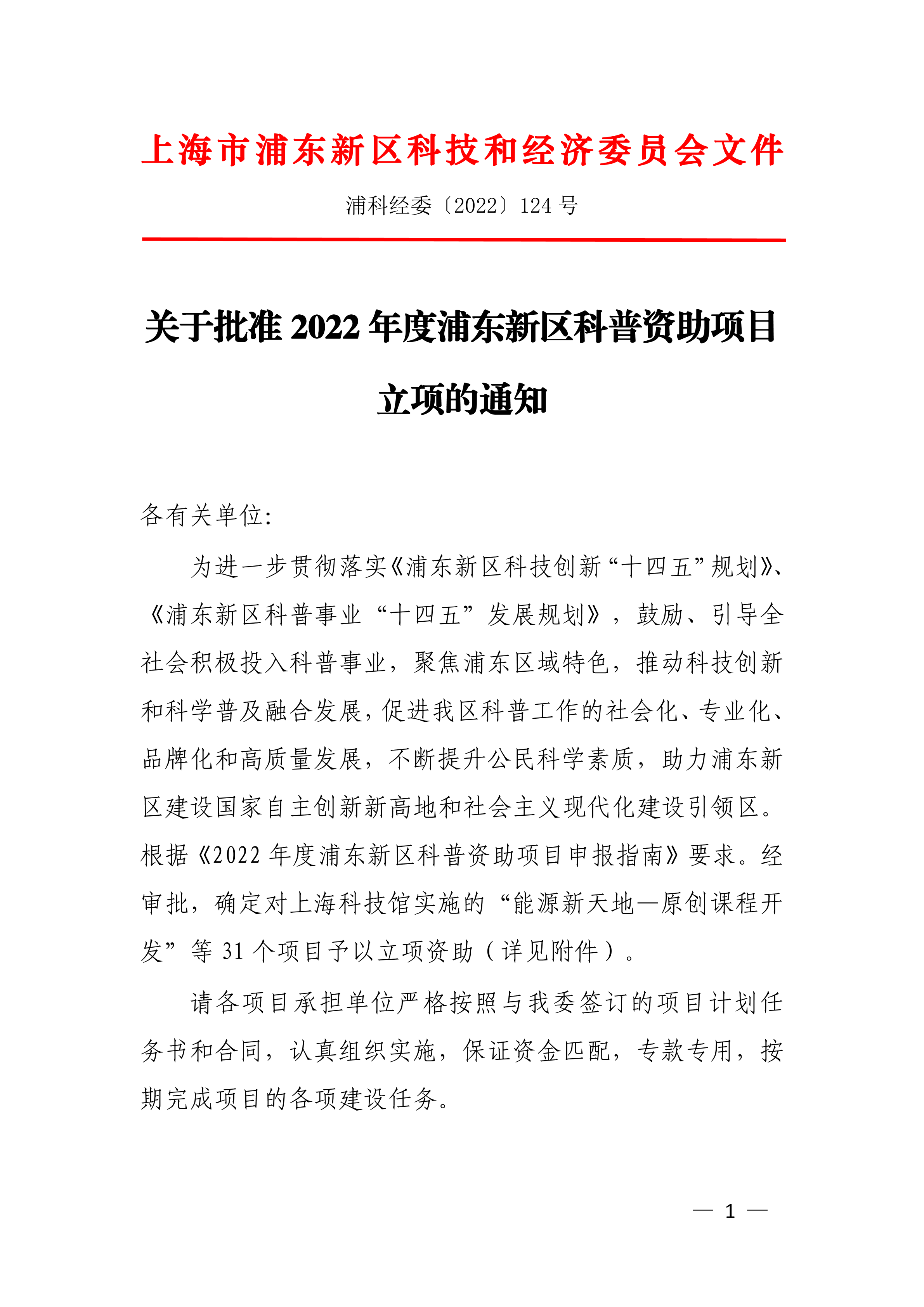 为进一步贯彻落实《浦东新区科技创新“十四五”规划》、《浦东新区科普事业“十四五”发展规划》,鼓励、引导全社会积极投入科普事业,聚焦浦东区域特色,推动科技创新和科学普及融合发展,促进我区科普工作的社会化、专业化、品牌化和高质量发展,不断提升公民科学素质,助力浦东新区建设国家自主创新新高地和社会主义现代化建设引领区。根据《2022年度浦东新区科普资助项目申报指南》要求。经审批,确定对上海科技馆实施的“能源新天地—原创课程开发”等31个项目予以立项资助(详见附件)。