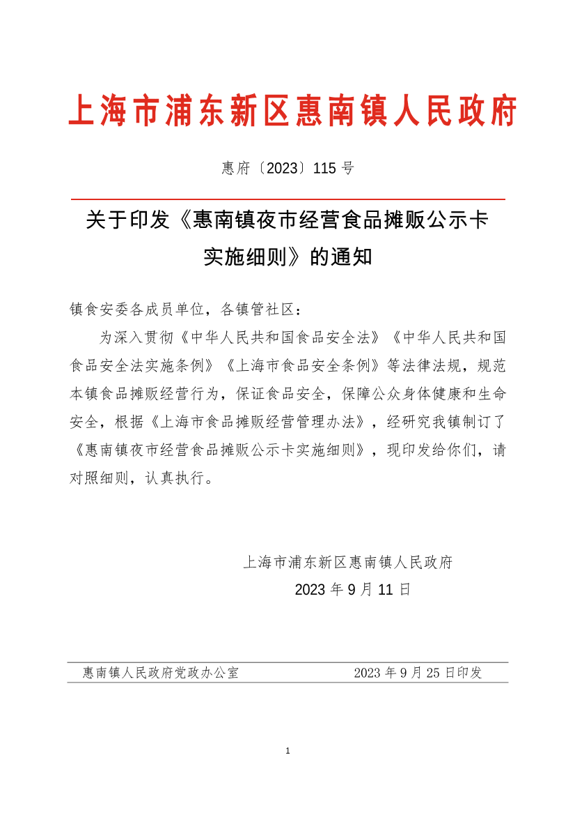 关于印发《惠南镇夜市经营食品摊贩公示卡实施细则》的通知