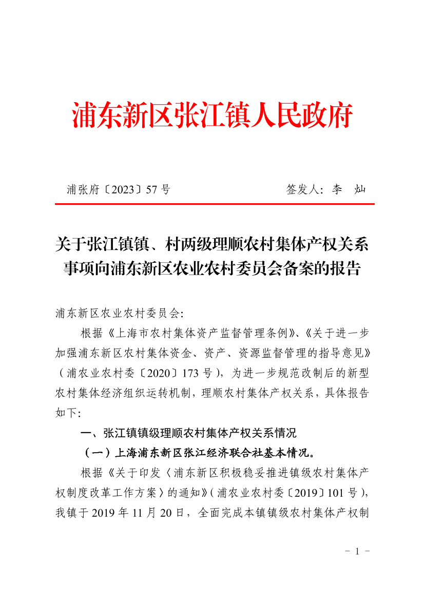 根据《关于印发〈浦东新区积极稳妥推进镇级农村集体产权制度改革工作方案〉的通知》(浦农业农村委〔2019〕101号),我镇于2019年11月20日,全面完成本镇镇级农村集体产权制度改革,成立“上海浦东新区张江经济联合社”。