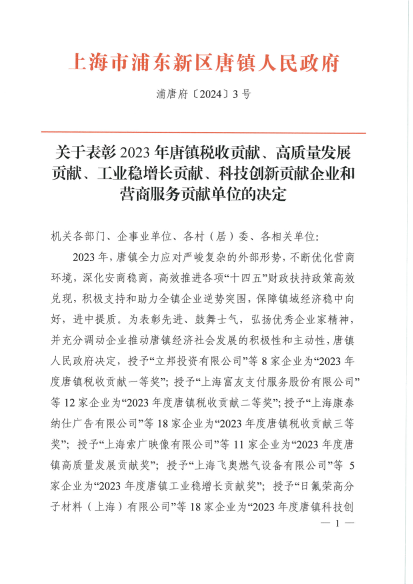 2023年,唐镇全力应对严峻复杂的外部形势,不断优化营商环境,深化安商稳商,高效推进各项“十四五”财政扶持政策高效兑现,积极支持和助力全镇企业逆势突围,保障镇域经济稳中向好,进中提质。为表彰先进、鼓舞士气,弘扬优秀企业家精神,并充分调动企业推动唐镇经济社会发展的积极性和主动性,唐镇人民政府决定,授予“立邦投资有限公司”等8家企业为“2023年度唐镇税收贡献一等奖”;授予“上海富友支付服务股份有限公司”等12家企业为“2023年度唐镇税收贡献二等奖”;授予“上海康泰纳仕广告有限公司”等18家企业为“2023年度唐镇税收贡献三等奖”;授予“上海索广映像有限公司”等11家企业为“2023年度唐镇高质量发展贡献奖”;授予“上海飞奥燃气设备有限公司”等5家企业为“2023年度唐镇工业稳增长贡献奖”;授予“日氟荣高分子材料(上海)有限公司”等18家企业为“2023年度唐镇科技创新贡献奖”;授予“浦东新区税务局第三十税务所”等5家单位为“2023年度唐镇营商服务贡献奖”。