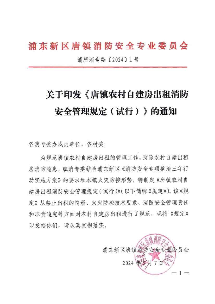 为规范唐镇农村自建房出租的管理工作,消除农村自建出租房消防隐患,结合浦东新区《消防安全专项整治三年行动实施方案》的要求和本镇火灾防控形势,特对农村自建房出租制定消防安全管理规定。