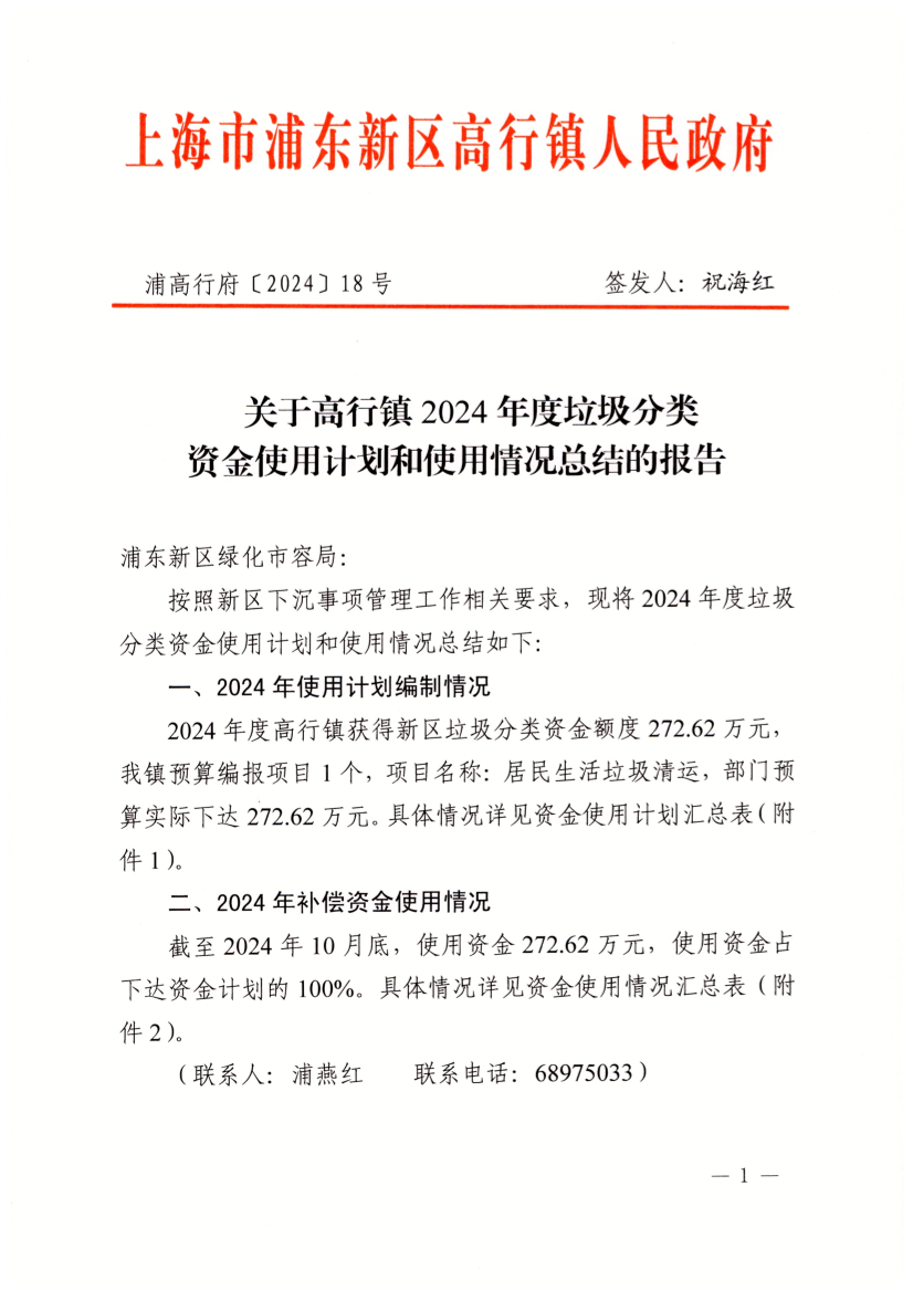 2024年度高行镇获得新区垃圾分类资金额度272.62万元,我镇预算编报项目1个,项目名称:居民生活垃圾清运,部门预算实际下达272.62万元。具体情况详见资金使用计划汇总表(附件1)。