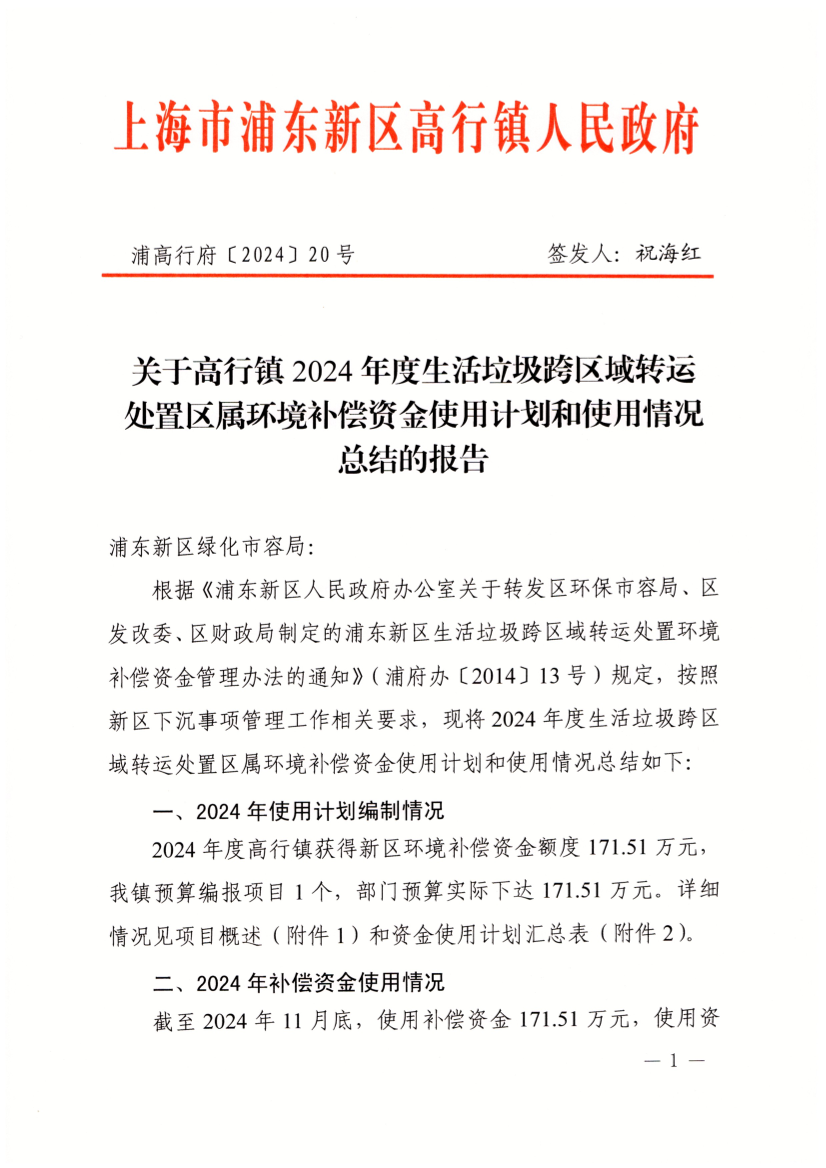 关于高行镇2024年度生活垃圾跨区域转运处置区属环境补偿资金使用计划和使用情况总结的报告