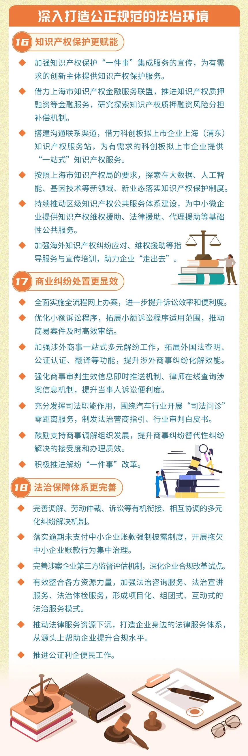 18、法治保障体系更完善。完善调解、劳动仲裁、诉讼等有机衔接、相互协调的多元化纠纷解决机制。落实逾期未支付中小企业账款强制披露制度,开展拖欠中小企业账款行为集中治理。完善涉案企业第三方监督评估机制,深化企业合规改革试点。有效整合各方资源力量,加强法治咨询服务、法治宣讲服务、法治体检服务,形成项目化、组团式、互动式的法治服务模式。推动法律服务资源下沉,打造企业身边的法律服务体系,从源头上帮助企业提升合规水平。推进公证利企便民工作。