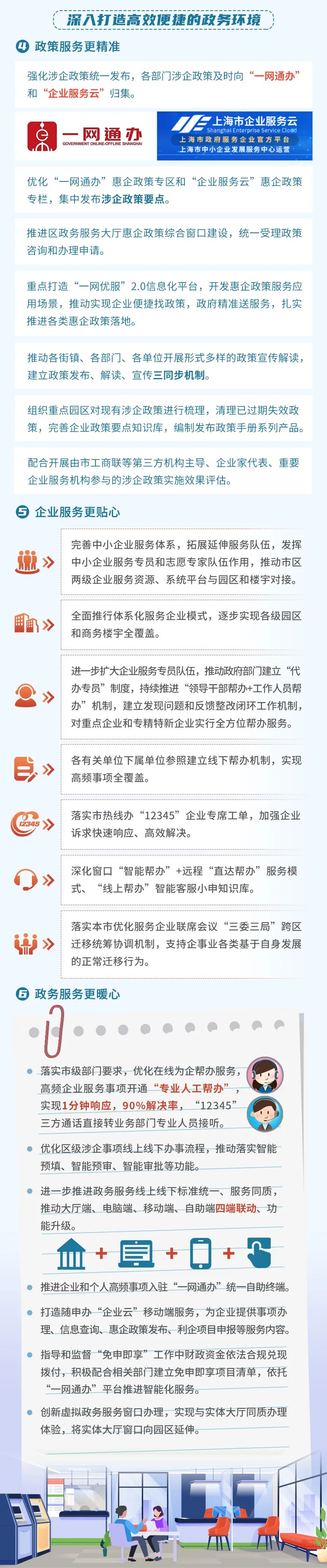 4、政策服务更精准。强化涉企政策统一发布,各部门涉企政策及时向“一网通办”和“企业服务云”归集。优化“一网通办”惠企政策专区和“企业服务云”惠企政策专栏,集中发布涉企政策要点。推进区政务服务大厅惠企政策综合窗口建设,统一受理政策咨询和办理申请。重点打造“一网优服”2.0信息化平台,开发惠企政策服务应用场景,推动实现企业便捷找政策,政府精准送服务,扎实推进各类惠企政策落地。推动各街镇、各部门、各单位开展形式多样的政策宣传解读,建立政策发布、解读、宣传三同步机制。组织重点园区对现有涉企政策进行梳理,清理已过期失效政策,完善企业政策要点知识库,编制发布政策手册系列产品。配合开展由市工商联等第三方机构主导、企业家代表、重要企业服务机构参与的涉企政策实施效果评估。