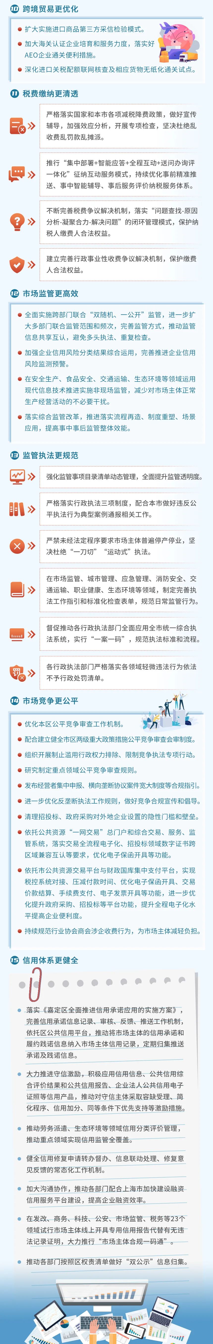 15、信用体系更健全。落实《嘉定区全面推进信用承诺应用的实施方案》,完善信用承诺信息记录、审核、反馈、推送工作机制,依托区公共信用平台,推动将市场主体的信用承诺和履约践诺信息纳入市场主体信用记录,定期归集推送承诺及践诺信息。大力推进守信激励,积极应用信用信息、公共信用综合评价结果和公共信用报告、企业法人公共信用电子证照等信用产品,推动对守信主体采取容缺受理、简化程序、信用加分、同等条件下优先支持等激励措施。推动劳务派遣、生态环境等领域信用分类评价管理,推动重点领域实现信用监管全覆盖。健全信用修复申请转办督办、信息联动处理、修复意见反馈的常态化工作机制。加大沟通协作,推动各部门配合上海市加快建设融资信用服务平台建设,提高企业融资效率。在发改、商务、科技、公安、市场监管、税务等23个领域试行市场主体线上开具专用信用报告代替有无违法记录证明,大力推行“市场主体合规一码通”。推动各部门按照区权责清单做好“双公示”信息归集。