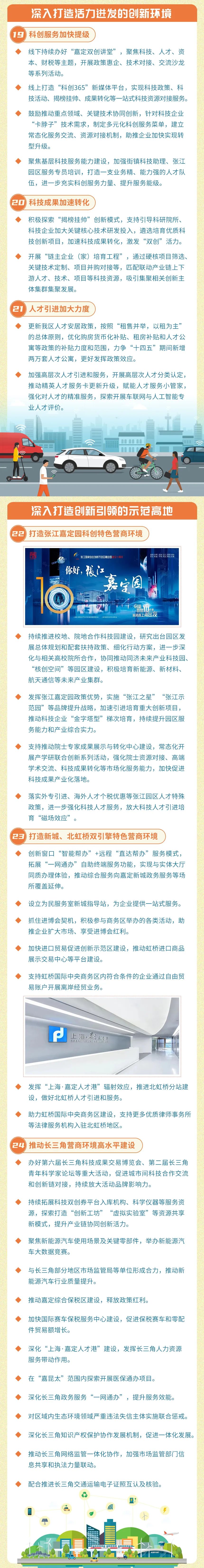 24、推动长三角营商环境高水平建设。办好第六届长三角科技成果交易博览会、第二届长三角青年科学家论坛等重大活动,促进城市间科技合作交流和创新链对接,持续放大活动品牌影响力。持续拓展科技双创券平台入库机构、科学仪器等服务资源,探索打造“创新工坊”“虚拟实验室”等资源共享新模式,提升产业链协同创新活力。聚焦新能源汽车使用场景及关键零部件,举办新能源汽车大数据竞赛。与长三角部分地区市场监管局等单位形成合力,推动新能源汽车行业质量提升。推动嘉定综合保税区建设,释放政策红利。加快国际赛车保税服务中心建设,促进保税赛车和零配件贸易额增长。深化“上海·嘉定人才港”建设,发挥长三角人力资源服务带动作用。在“嘉昆太”范围内探索开展医保通办项目。深化长三角政务服务“一网通办”,提升服务效能。对区域内生态环境领域严重违法失信主体实施联合惩戒。深化长三角知识产权保护协作发展机制,促进一体化发展。推动长三角网络监管一体化协作,加强市场监管部门信息共享和执法力量联动。配合推进长三角交通运输电子证照互认及核验。