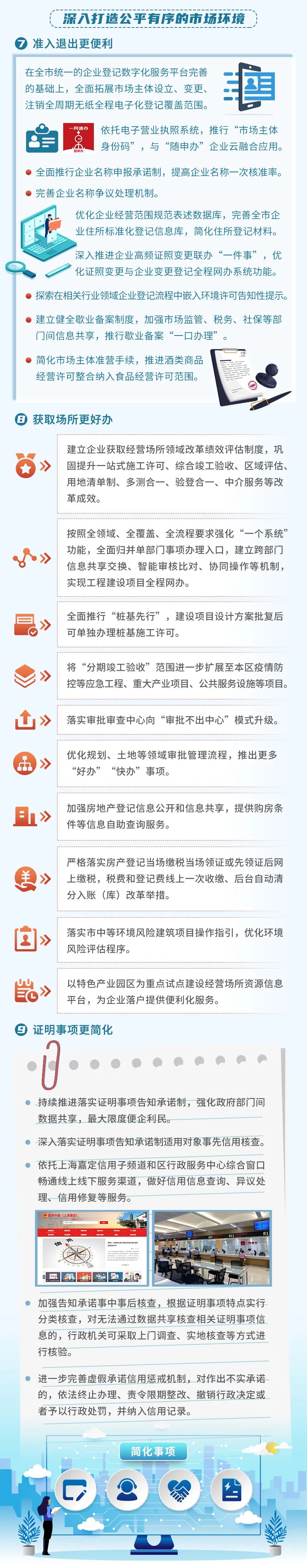7、准入退出更便利。在全市统一的企业登记数字化服务平台完善的基础上,全面拓展市场主体设立、变更、注销全周期无纸全程电子化登记覆盖范围。依托电子营业执照系统,推行“市场主体身份码”,与“随申办”企业云融合应用。全面推行企业名称申报承诺制,提高企业名称一次核准率。完善企业名称争议处理机制。优化企业经营范围规范表述数据库,完善全市企业住所标准化登记信息库,简化住所登记材料。深入推进企业高频证照变更联办“一件事”,优化证照变更与企业变更登记全程网办系统功能。探索在相关行业领域企业登记流程中嵌入环境许可告知性提示。建立健全歇业备案制度,加强市场监管、税务、社保等部门间信息共享,推行歇业备案“一口办理”。简化市场主体准营手续,推进酒类商品经营许可整合纳入食品经营许可范围。