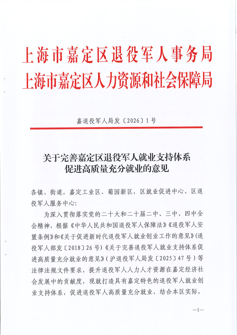 为深入贯彻落实党的二十大和二十届二中、三中、四中全会精神,根据《中华人民共和国退役军人保障法》《退役军人安置条例》和《关于促进新时代退役军人就业创业工作的意见》(退役军人部发〔2018〕26号)《关于完善退役军人就业支持体系促进高质量充分就业的意见》(沪退役军人局发〔2025〕47号)等法律法规文件要求,提升退役军人人力人才资源在嘉定经济社会发展中的贡献度,现就打造具有嘉定特色的退役军人就业创业支持体系,促进退役军人高质量充分就业,结合本区实际,提出以下意见。