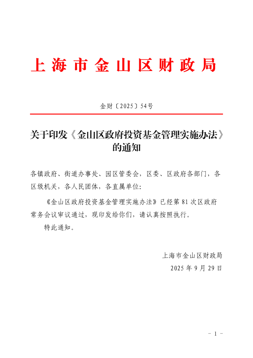 《金山区政府投资基金管理实施办法》已经第81次区政府常务会议审议通过,现印发给你们,请认真按照执行。