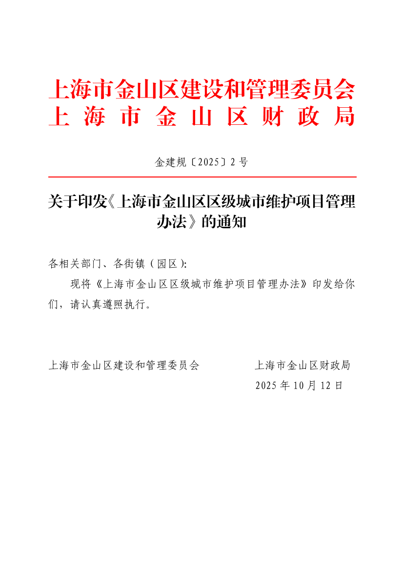现将《上海市金山区区级城市维护项目管理办法》印发给你们,请认真遵照执行。