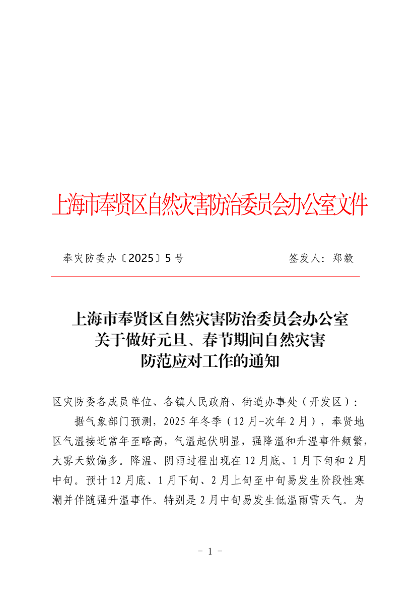 据气象部门预测,2025年冬季(12月-次年2月),奉贤地区气温接近常年至略高,气温起伏明显,强降温和升温事件频繁,大雾天数偏多。降温、阴雨过程出现在12月底、1月下旬和2月中旬。预计12月底、1月下旬、2月上旬至中旬易发生阶段性寒潮并伴随强升温事件。特别是2月中旬易发生低温雨雪天气。为更好地做好元旦、春节期间自然灾害防范应对工作,现就有关工作通知如下: