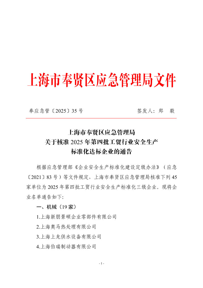 上海市奉贤区应急管理局关于核准2025年第四批工贸行业安全生产标准化达标企业的通告