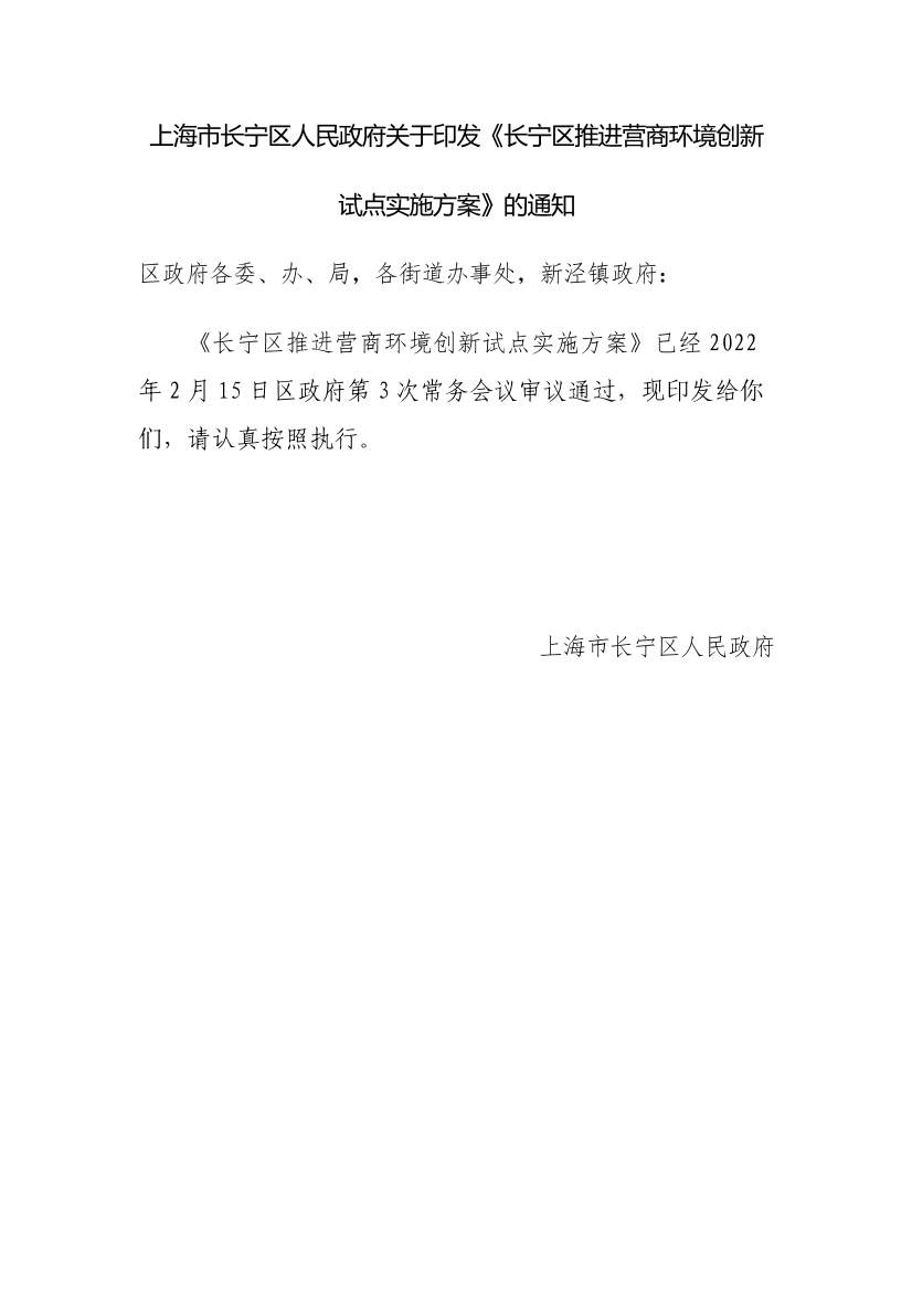 《长宁区推进营商环境创新试点实施方案》已经2022年2月15日区政府第3次常务会议审议通过,现印发给你们,请认真按照执行。