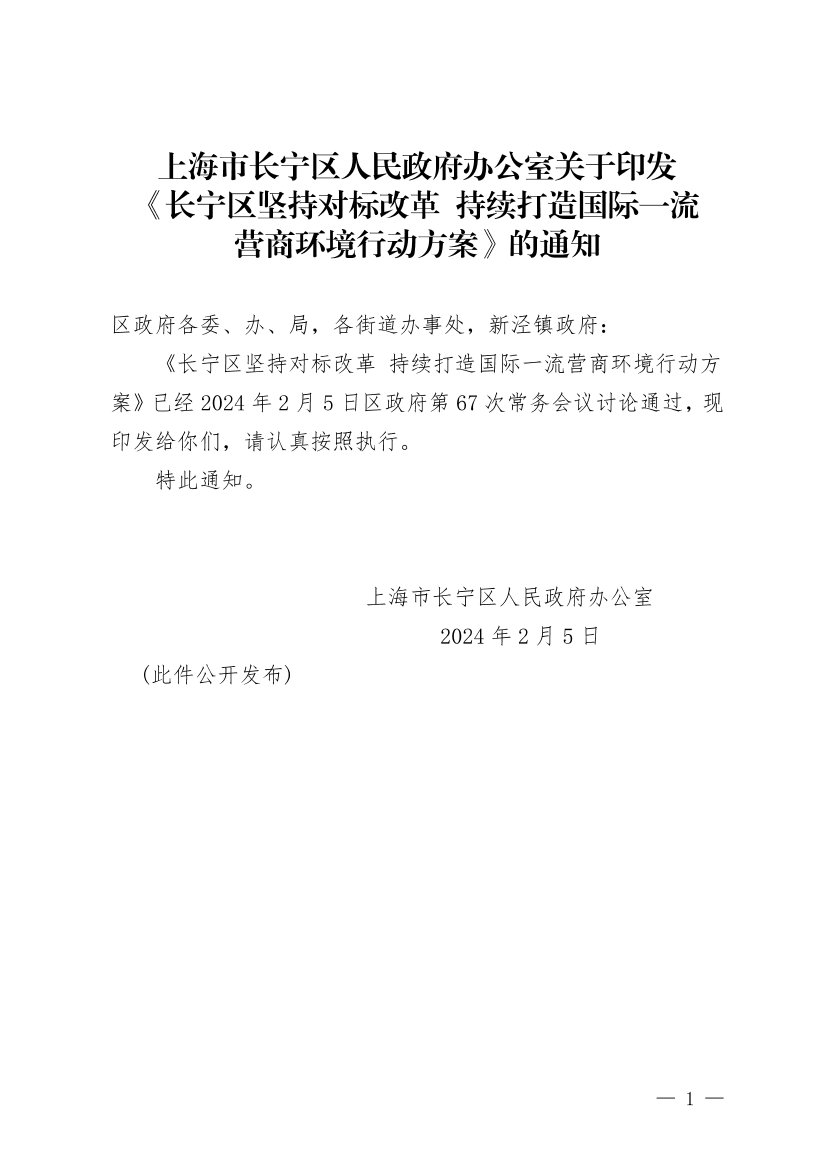 《长宁区坚持对标改革 持续打造国际一流营商环境行动方案》已经2024年2月5日区政府第67次常务会议讨论通过,现印发给你们,请认真按照执行。