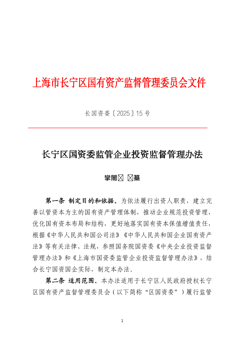 第二条 适用范围。本办法适用于长宁区人民政府授权长宁区国有资产监督管理委员会(以下简称“区国资委”)履行监管职责的企业开展投资活动的监督管理。
