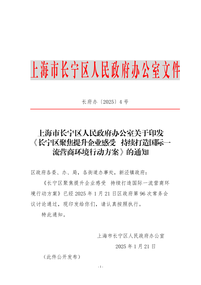 《长宁区聚焦提升企业感受 持续打造国际一流营商环境行动方案》已经2025年1月21日区政府第96次常务会议讨论通过,现印发给你们,请认真按照执行。