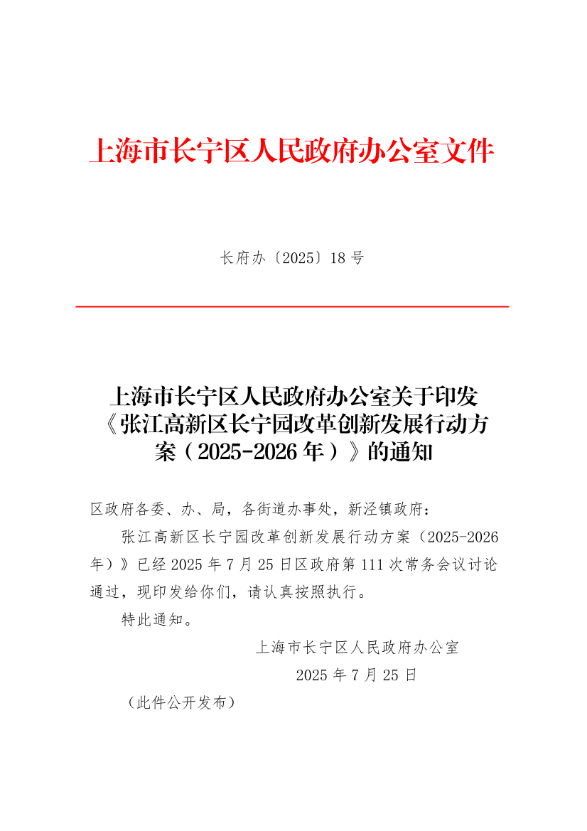 张江高新区长宁园改革创新发展行动方案(2025-2026年)》已经2025年7月25日区政府第111次常务会议讨论通过,现印发给你们,请认真按照执行。