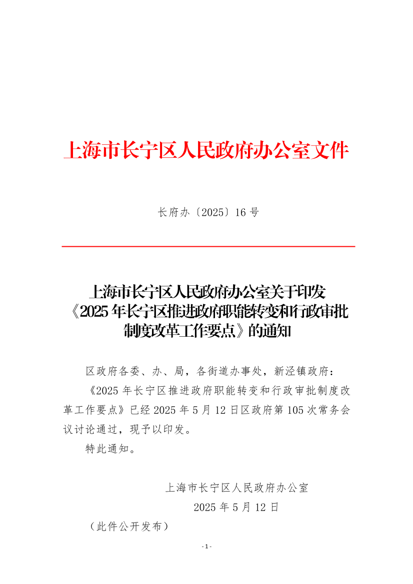 《2025年长宁区推进政府职能转变和行政审批制度改革工作要点》已经2025年5月12日区政府第105次常务会议讨论通过,现予以印发。