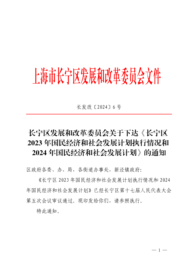 长宁区发展和改革委员会关于下达《长宁区2023年国民经济和社会发展计划执行情况和2024年国民经济和社会发展计划》的通知