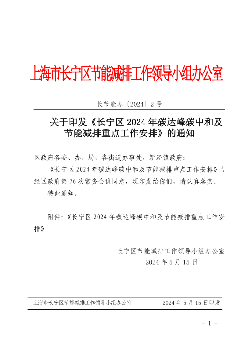 关于印发《长宁区2024年碳达峰碳中和节能减排重点工作安排》的通知
