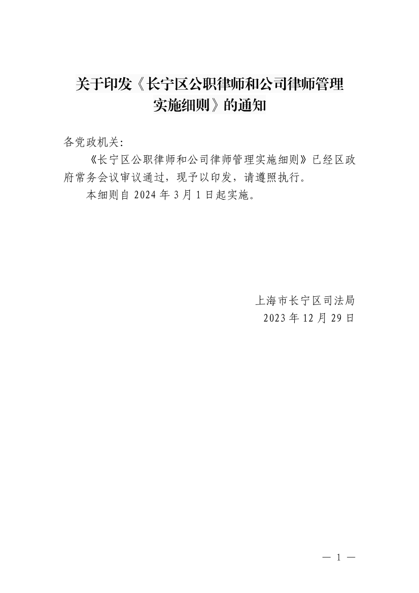 《长宁区公职律师和公司律师管理实施细则》已经区政府常务会议审议通过,现予以印发,请遵照执行。