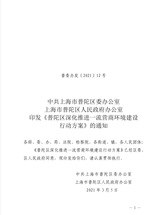 为深入贯彻国家、上海市关于优化营商环境部署安排,进一步落实《上海市优化营商环境条例》和《上海市加强改革系统集成持续深化国际一流营商环境建设行动方案》,持续推进打造普陀“人靠谱、事办妥”的营商环境,以“不叫不到、随叫随到、服务周到、说到做到”的“四到”服务,让企业办事更省心、经营更放心、发展更顺心、扎根更安心,特制订本行动方案: