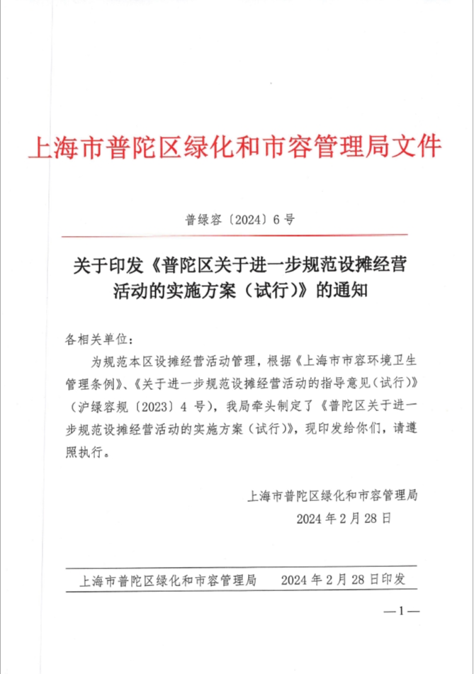 为规范本区设摊经营活动管理,根据《上海市市容环境卫生管理条例》、《关于进一步规范设摊经营活动的指导意见(试行)》(沪绿容规〔2023〕4号),我局牵头制定了《普陀区关于进一步规范设摊经营活动的实施方案(试行)》,现印发给你们,请遵照执行。