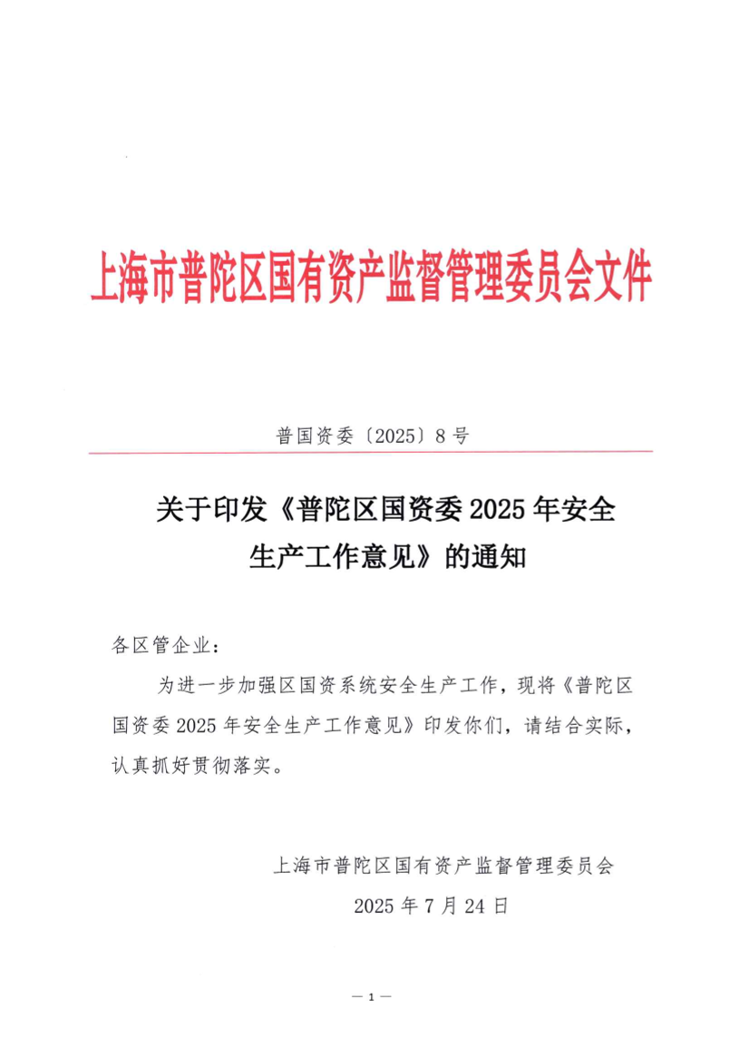为进一步加强区国资系统安全生产工作,现将《普陀区国资委2025年安全生产工作意见》印发你们,请结合实际,认真抓好贯彻落实。