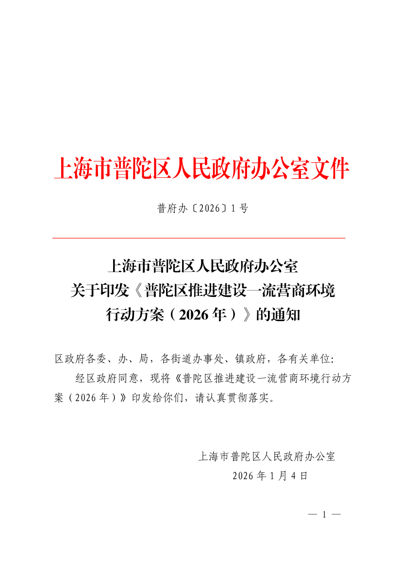 经区政府同意,现将《普陀区推进建设一流营商环境行动方案(2026年)》印发给你们,请认真贯彻落实。