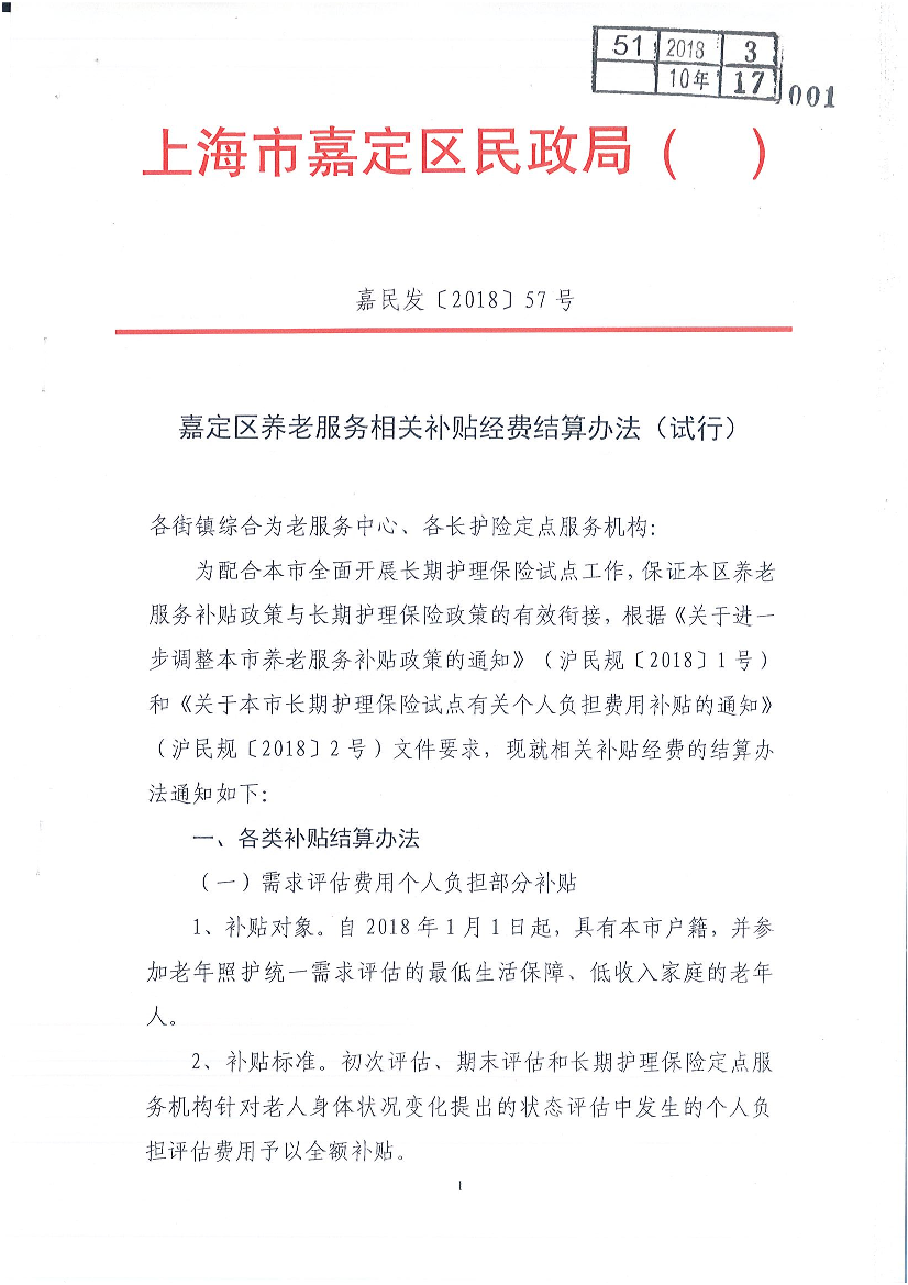 为配合本市全面开展长期护理保险试点工作,保证本区养老服务补贴政策与长期护理保险政策的有效衔接,根据《关于进一步调整本市养老服务补贴政策的通知》(沪民规〔2018〕1号)和《关于本市长期护理保险试点有关个人负担费用补贴的通知》(沪民规〔2018〕2号)文件要求,现就相关补贴经费的结算办法通知如下: